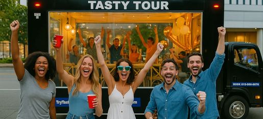 Our Nashville party tours provide you with an awesome way to see the sights of downtown Nashville. We take a maximum of 12 people in our enclosed floor to ceiling glass wall sightseeing truck and expose them to an amazing downtown Nashville tour. Don’t worry about rain , cold or heat, we have you covered. Tasty Tour is temperature controlled. We offer a 1 hr 30 min tour along the famous streets of Nashville. Our custom designed sightseeing truck is one of a kind. You’ll be surrounded with a beautiful live edge hand made TN wood table and bench seating, a mural wall of Nashville for your selfie photos and all the music is played exclusively for you. If you book a private tour you control the music from your phone.